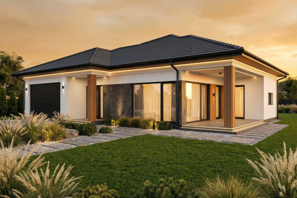 Moderna prizemna kuća savremenog dizajna, oblikovana čistim linijama i toplim kombinacijama materijala. Velike staklene površine i naglašeni drveni i betonski…